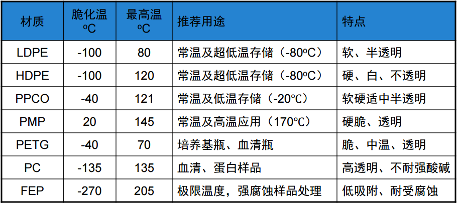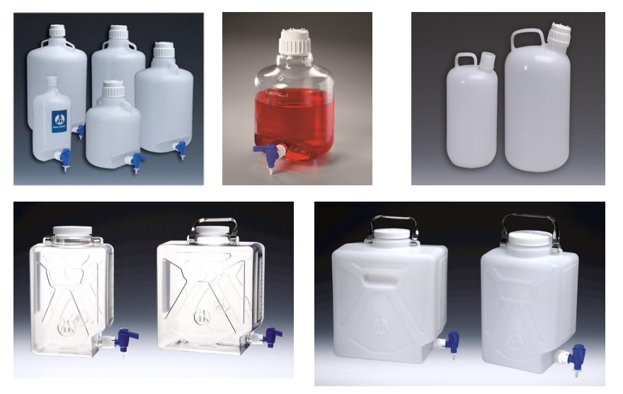 ? 不同材質滿足盛放不同物質的需求:LDPE,HDPE,PET,PP,PC,氟化材質等。