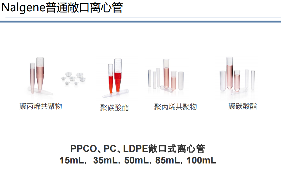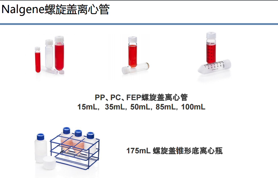 Nalgene提供PMP、PPCO、PC和TEFZEL ETFE樹脂等各種材料制成的尖底和圓底高速(Max:50000xg)離心管,其設計可滿足您在機械強度、耐高溫高壓性、溫度和/或耐化學性等各個方面的應用要求。尖底管帶有易于讀取的模制刻度。圓底管都具有相同的管壁厚度,機械強度更高,實用性更強。Nalgene離心管根據蓋子類型可以分為敞口型、螺旋蓋型和密封蓋型離心管(瓶)。