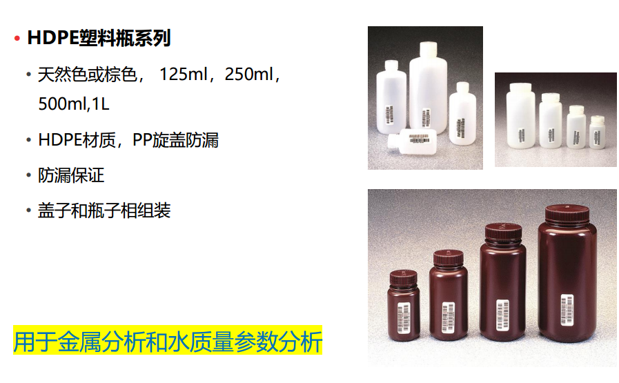 ? 采用高純凈度樹脂原料,所有瓶不含混合劑或塑化劑,如鄰苯二甲酸鹽(PVC瓶除外),消除了樣品的污染;