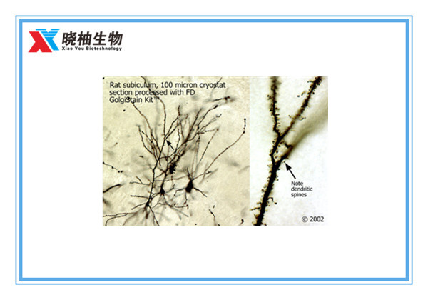FD NeuroTechnologies, Inc(USA)公司生產(chǎn)的FD快速高爾基體染色試劑盒(FD Rapid GolgiStainTM Kit)是根據(jù)Ramón- Moliner[1],Glaser and Van derLoos [2]描述的方法所開發(fā)的。本試劑盒不僅顯著改善和簡化Golgi-Cox 技術(shù),而且經(jīng)證實檢測數(shù)據(jù)非常可靠,且能靈敏反映神經(jīng)元和神經(jīng)膠質(zhì),特別是樹突棘的形態(tài)學(xué)細節(jié)。FD快速高爾基體染色試劑盒(FD Rapid GolgiStainTM Kit)已被廣泛應(yīng)用于數(shù)種動物大腦和死后人腦樣本的染色檢測中。并有大量的文獻數(shù)據(jù)(超過500篇,詳見使用手冊內(nèi)整理的具體文獻來源)給予支撐,是你可靠的選擇。